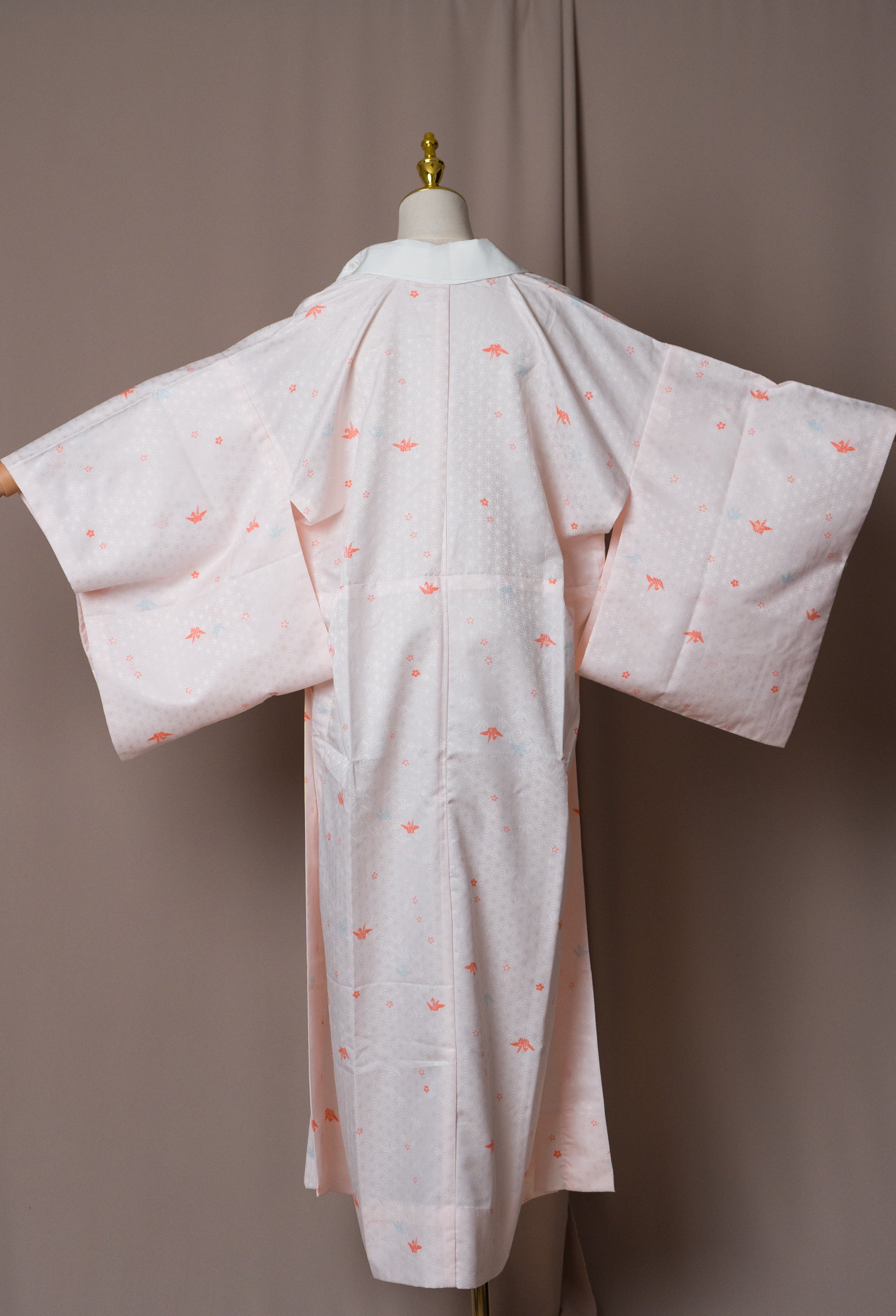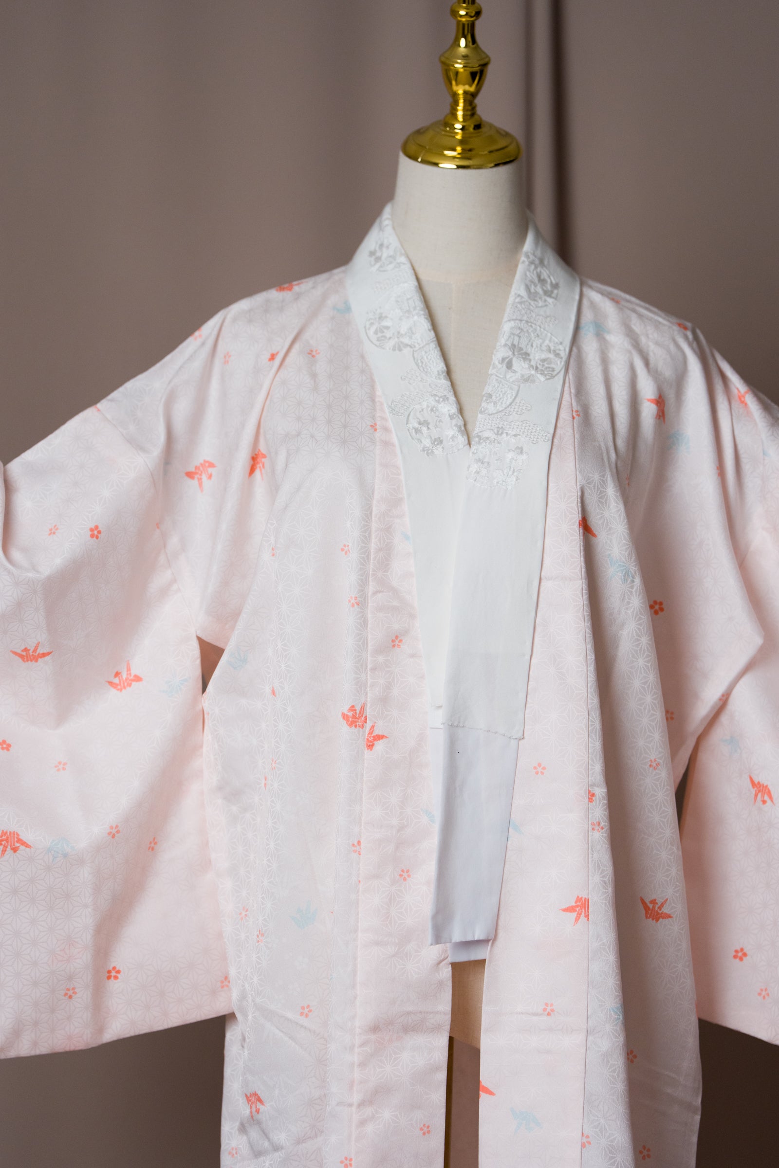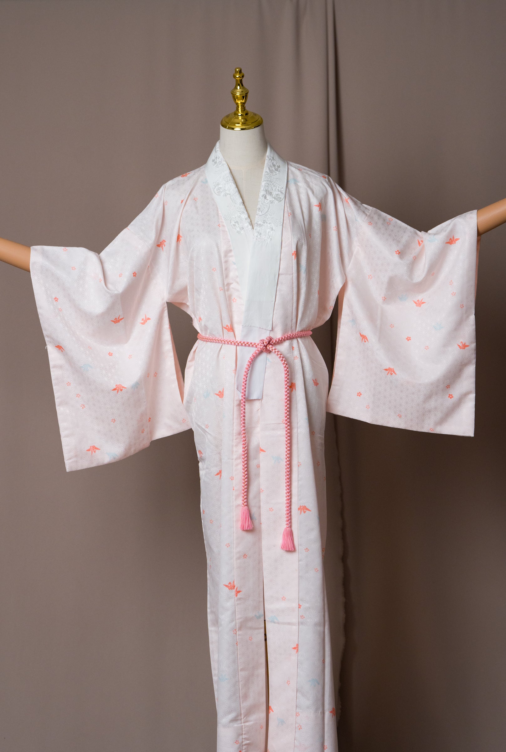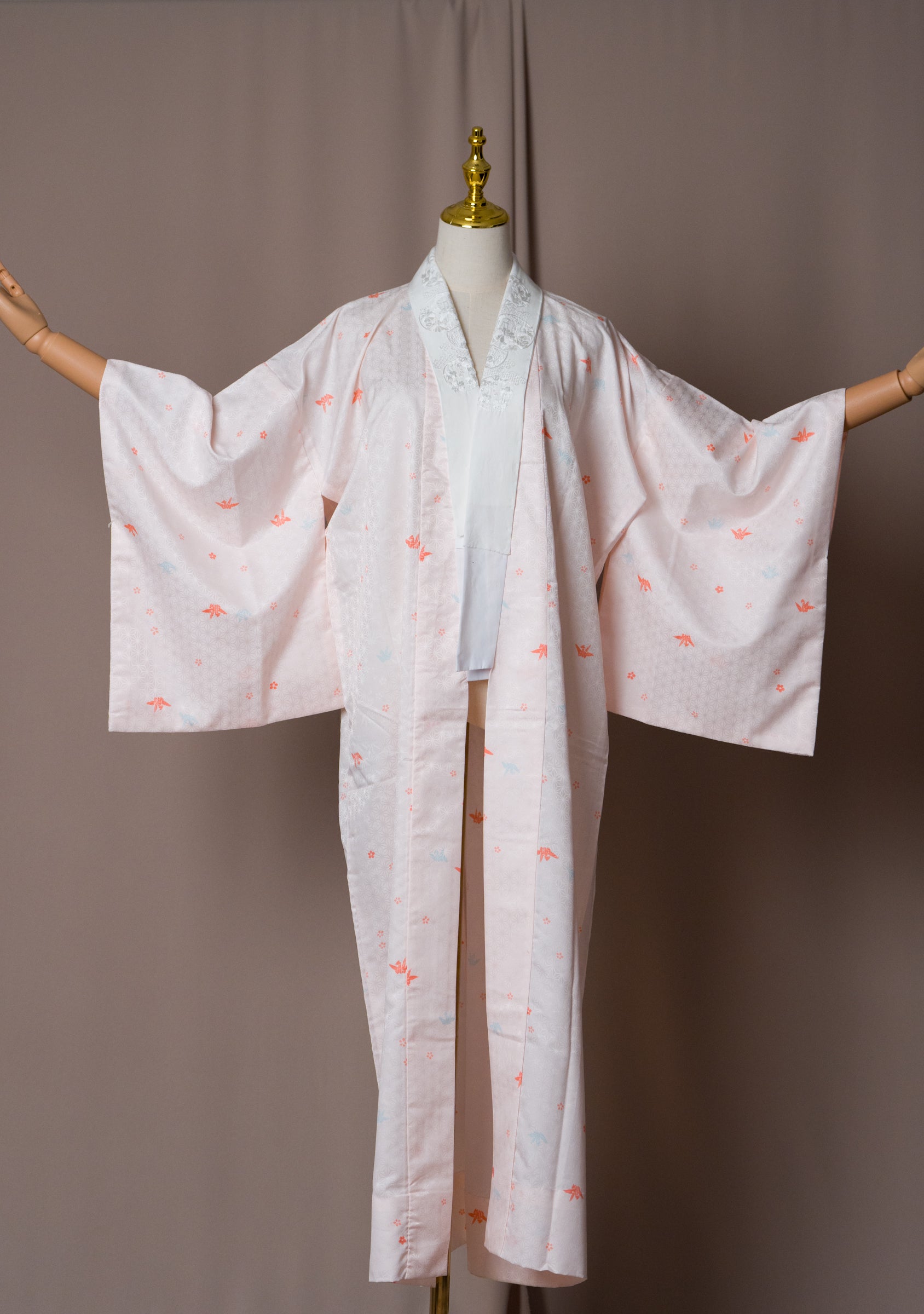 Този винтидж нагаджубан в нежен розово-ружов нюанс е с деликатни мотиви на жерави, и бяла яка с бродерия. Традиционно носена като вътрешен слой кимоно, тази дреха е лека, гладка и нежна към кожата. Може да се носи като халат у дома, за плажа или като курортно облекло, както и като лека туника през лятото. Нежният цвят и изисканият модел я правят елегантна и универсална дреха.