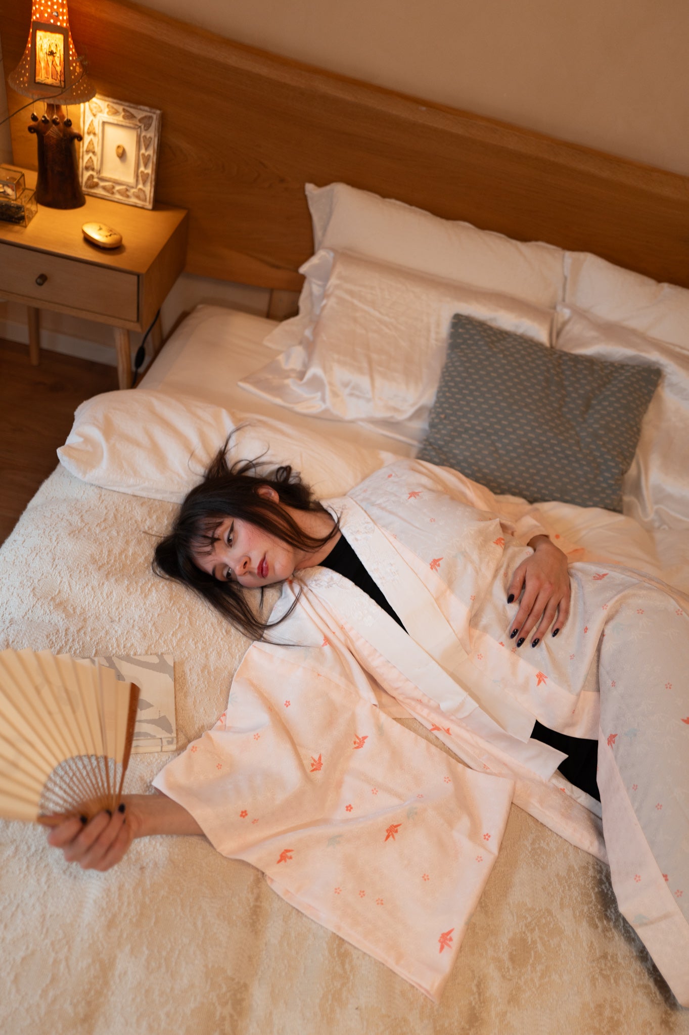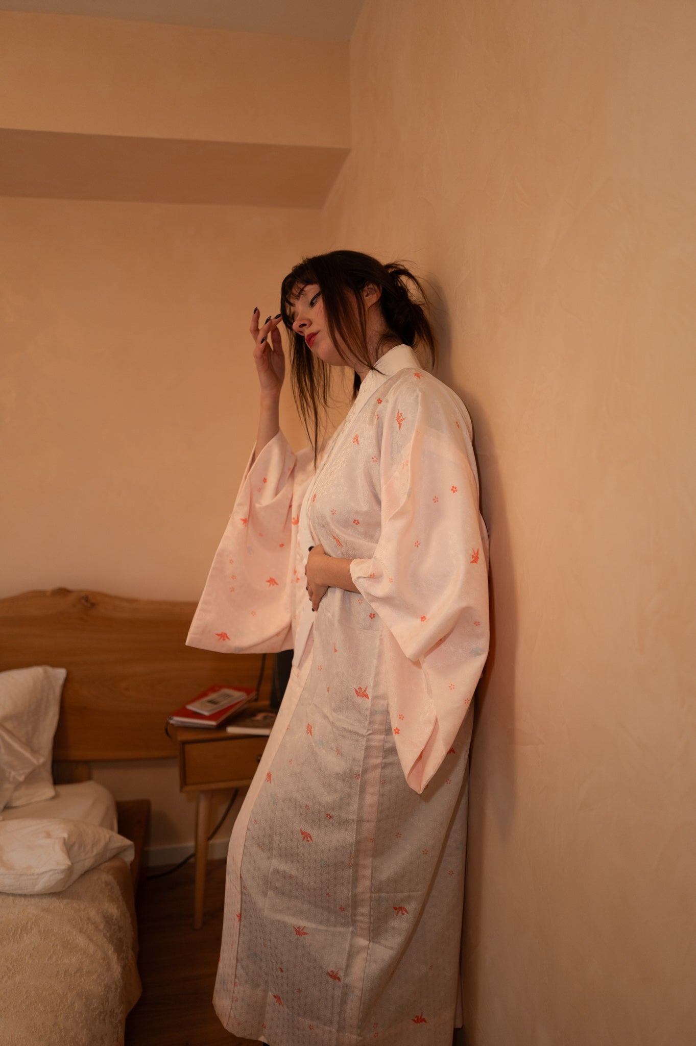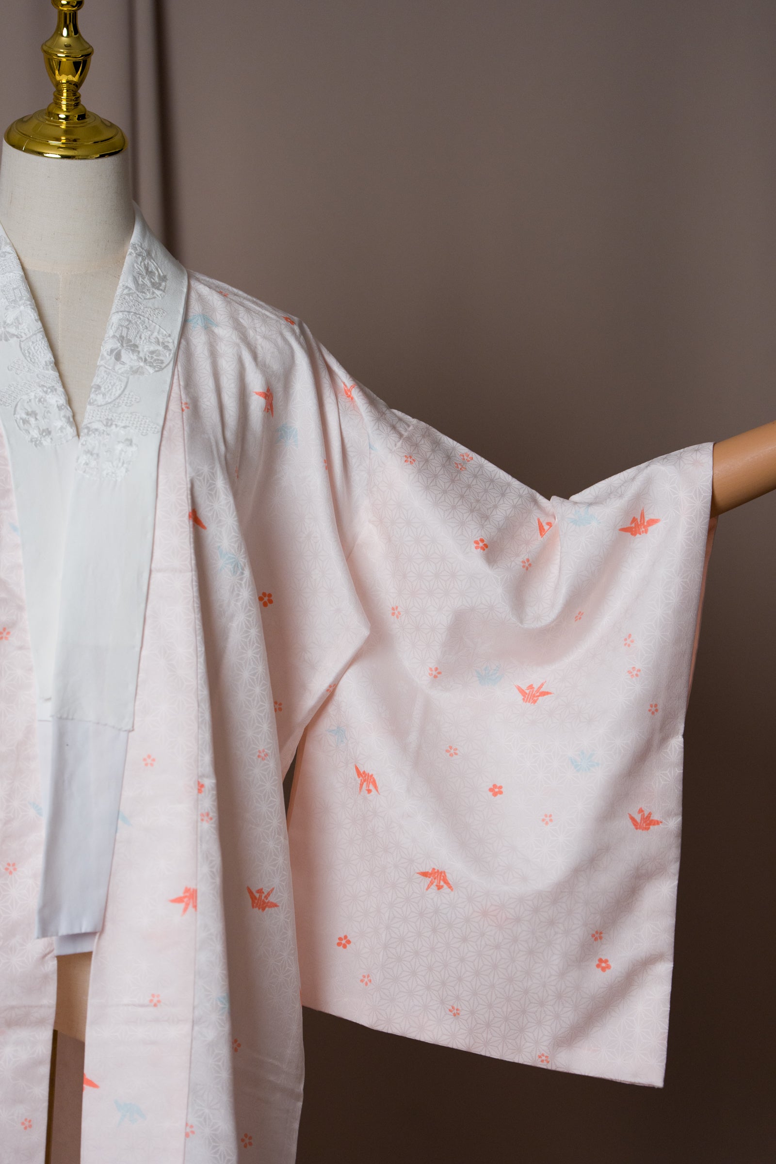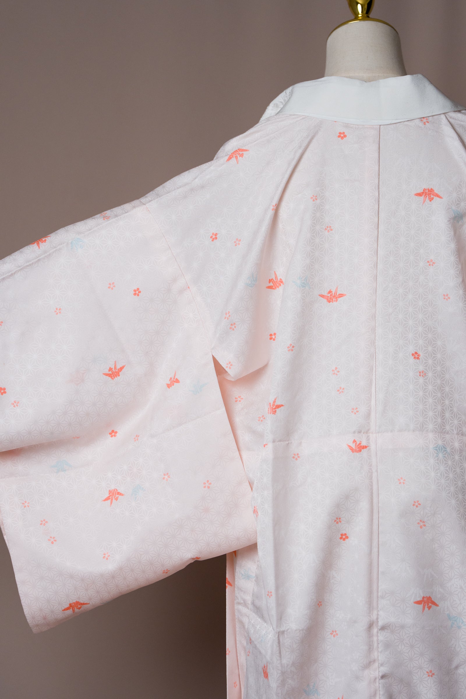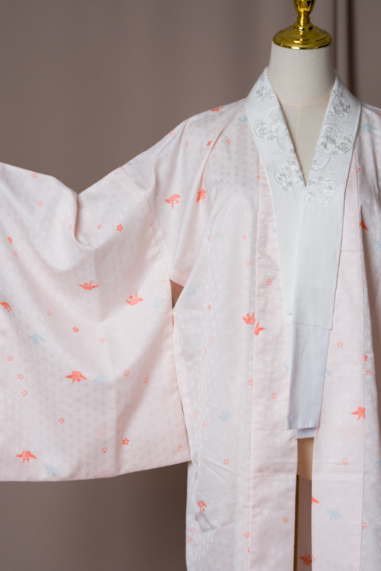 Този винтидж нагаджубан в нежен розово-ружов нюанс е с деликатни мотиви на жерави, и бяла яка с бродерия. Традиционно носена като вътрешен слой кимоно, тази дреха е лека, гладка и нежна към кожата. Може да се носи като халат у дома, за плажа или като курортно облекло, както и като лека туника през лятото. Нежният цвят и изисканият модел я правят елегантна и универсална дреха.